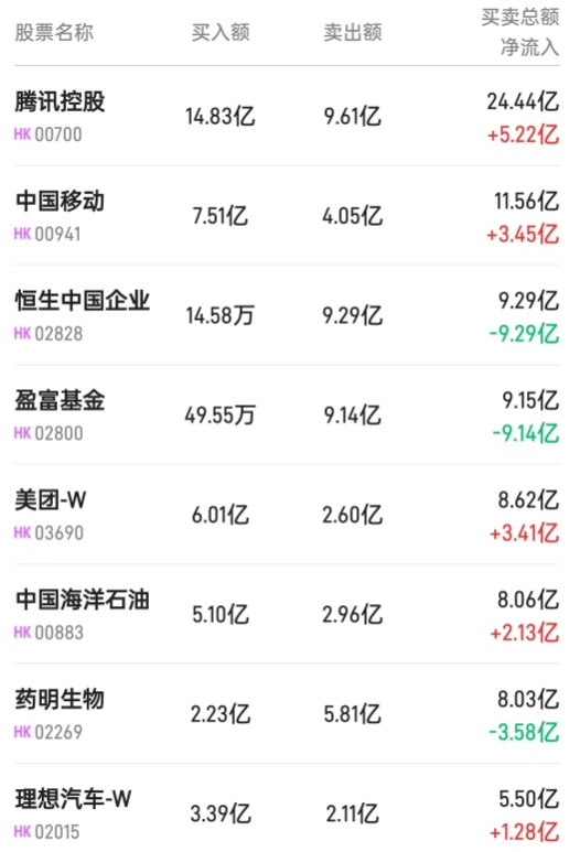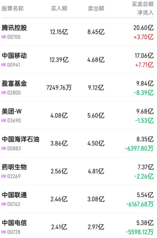 ETF方面,盈富基金(02800)、恒生中国企业(02828)、南方恒生科技(03033)分别遭净卖出17.52亿、9.28亿、3.65亿港元。个股方面,建设银行(00939)获净买入2994万港元。