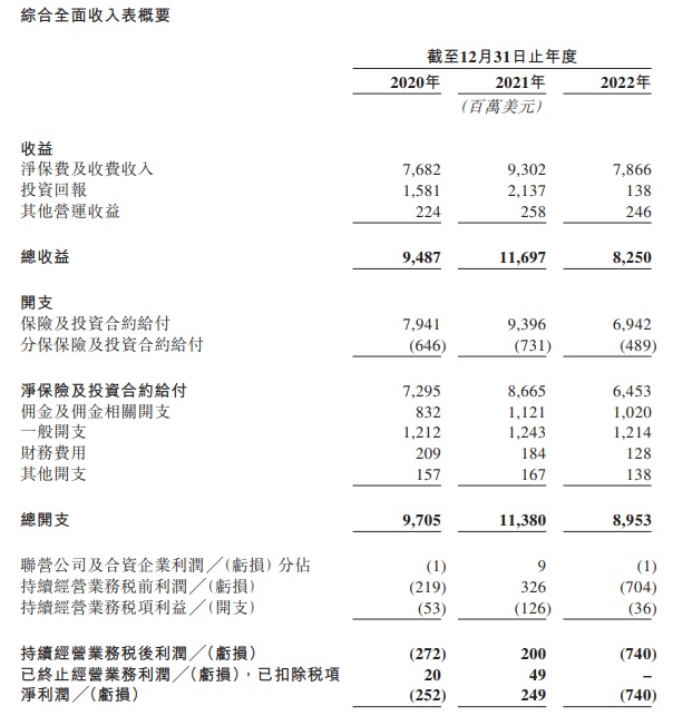 财务方面,于2020年、2021年、2022年,公司总收益分别为94.87亿美元、116.97亿美元、82.5亿美元。其中,净保费及收费收入分别为76.82亿美元、93.02亿美元、78.66亿美元。公司实现净利润分别为-2.52亿美元、2.49亿美元、-7.4亿美元。
