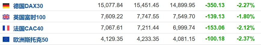 2.截至发稿,德国DAX指数跌2.27%,英国富时100指数跌1.80%,法国CAC40指数跌2.12%,欧洲斯托克50指数跌2.37%。