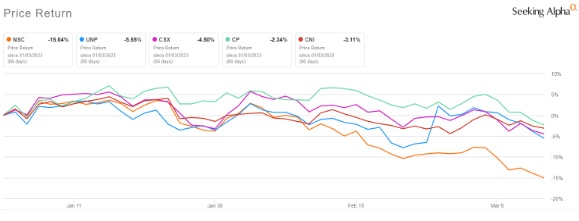 由于俄亥俄州东巴勒斯坦的脱轨灾难,美国铁路行业的弊病的代表公司诺福克南方公司(NSC.US)已经引领该行业的下跌。今年年初,该领域所有主要运营商的股价回报水平均为负。尽管人们越来越担心铁路行业将受到打击,但分析师们建议,对股价的惩罚可能过头了。