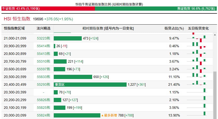 法兴恒指牛熊证街货分布图中的数据显示,熊证街货重货区在20400-20499区间,该区间最新熊证数量为1227张,较上一交易日增加361张;最多新增在20000-20099区间,该区间最新熊证数量为788张,较上一交易日增加788张。