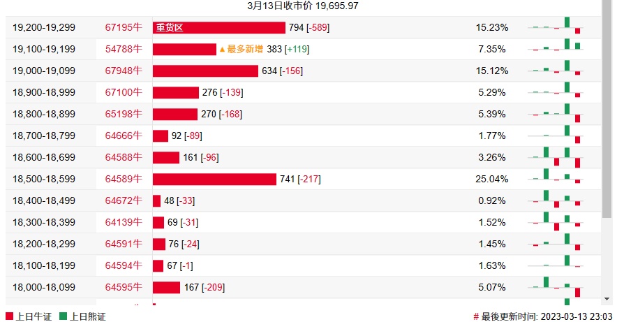 牛证街货重货区在19200-19299区间,该区间最新牛证数量为794张,较上一交易日减少589张;最多新增亦在19100-19199区间,该区间最新牛证数量为383张,较上一交易日增加119张。