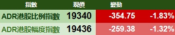 智通财经APP获悉,周一美股三大指数涨跌不一,港股ADR指数下跌,按比例计算,收报19340点,较香港收市跌354.75点或1.83%。