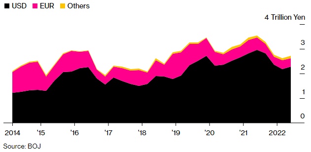 日本央行数据显示,到 2022 年 4 月至 6 月,日本大型银行持有的美元债券的风险价值已增至 2.29 万亿日元(170 亿美元),而 2014 年初为 1.2 万亿日元。地区银行的风险敞口在同一时期几乎翻了一番。这些指标衡量的是当利率上升 200 个基点时他们将遭受多少损失。