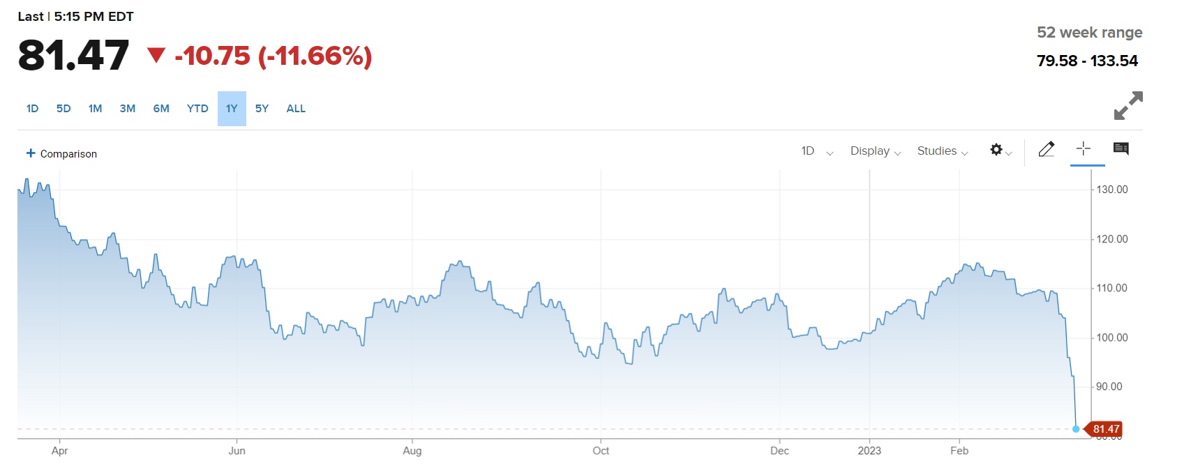 包括摩根大通(JPM.US)、高盛(GS.US)和富国银行(WFC.US)等国际金融巨头在内的KBW银行指数在周一暴跌近12%,创下2020年3月以来最大跌幅。其中,花旗集团(C.US)和富国银行股价跌幅超过7%,美国银行(BAC.US)跌幅接近6%。市值如此庞大的这些华尔街超级商业银行巨头股价跌幅巨大实属罕见,由此可见市场对于美国银行业流动性风险的担忧情绪仍然非常浓厚。