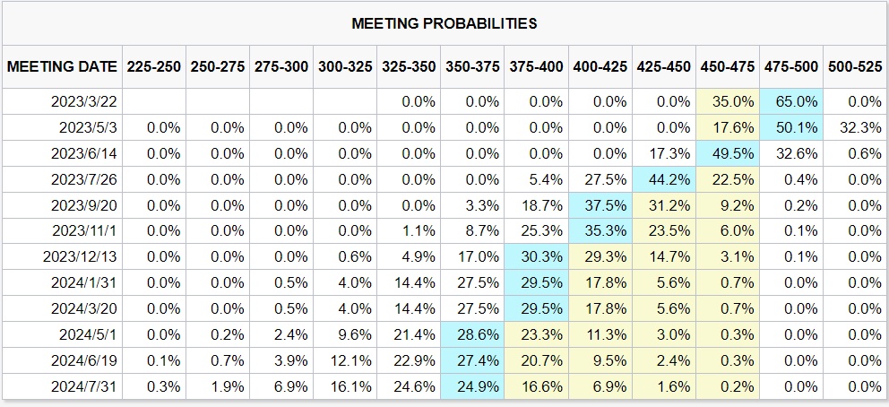 CME“美联储观察”工具显示,3月加息50个基点的概率已大幅下降至0,3月不加息的概率已经攀升至35%;利率期货市场对于本轮加息周期的利率峰值预期则大幅降至4.75%-5.0%,此前为远高于当前水平的5.50%-5.75%;利率期货市场还预计美联储将在年底前降息三次(此前预期为明年3月左右开始第一次降息),不过对于具体的降息时间则存在一些分歧。而这些预期有可能为2023年下半年的股市反弹奠定基础。
