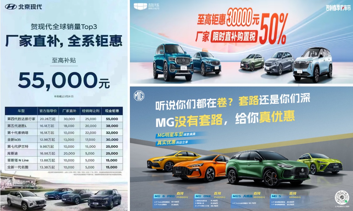 智通财经APP获悉,车市“史上最卷价格战”仍在进行中。3月13日,北京现代推出了全系限时补贴活动,范围为全国,最高可享受 5.5 万元的优惠力度,涵盖胜达旅行家、途胜 L、索纳塔、伊兰特 3 等多款 SUV、轿车、MPV 车型;同日,吉利汽车(00175)发布购置税减半显示补贴政策,补贴最高可达3万元,全国用户均可参与活动;MG宣布再次推出“购车大促”,增促力度最大的是MG6和MG ONE两款车型,最高可享受15000元补贴。上述三家车企的活动,截止日均为3月31日。