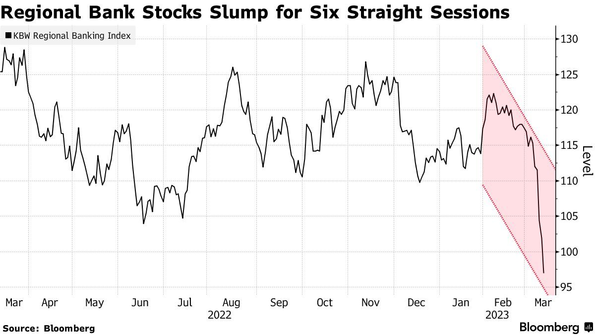 在周一,美股银行股震荡进一步加剧,包括摩根大通(JPM.US)、高盛(GS.US)和富国银行(WFC.US)等国际金融巨头在内的KBW银行指数在周一暴跌近12%,创下2020年3月以来最大跌幅。其中,花旗集团(C.US)和富国银行股价跌幅超过7%,美国银行(BAC.US)跌幅接近6%。市值如此庞大的这些华尔街超级商业银行巨头股价跌幅巨大实属罕见,由此可见市场对于美国银行业流动性风险的担忧情绪仍然非常浓厚。