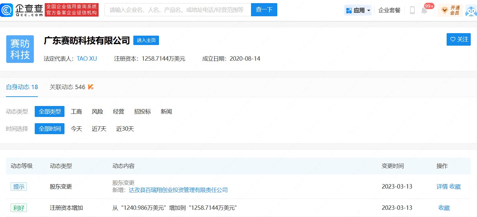 智通财经APP获悉,企查查APP显示,近日,广东赛昉科技有限公司发生工商变更,新增百度旗下达孜县百瑞翔创业投资管理有限责任公司为股东,同时注册资本由约1241万美元增至约1258.7万美元。