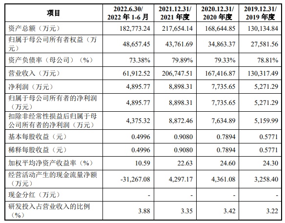 财务方面,于2019年度、2020年度、2021年度以及2022年6月30日止,公司实现营业收入分别为13.03亿元、16.74亿元、20.67亿元、6.19亿元。其中,公司实现净利润分别为5271.29万元、7735.65万元、8898.31万元、4895.77万元。