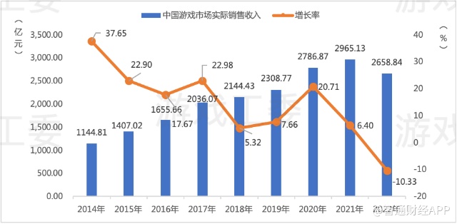 2022年,受宏观经济形势承压、疫情后消费信心不足等多重因素影响,整个游戏行业都在经历严酷“寒冬”。据中国音数协游戏工委披露的游戏产业数据摘要,2022年中国游戏市场实际销售收入2658.84亿元,同比减少306.29亿元,下降10.33%,游戏用户规模6.64亿人;自主研发游戏国内市场实销收入2223.77亿元,移动游戏市场实际销售收入1930.58亿元。
