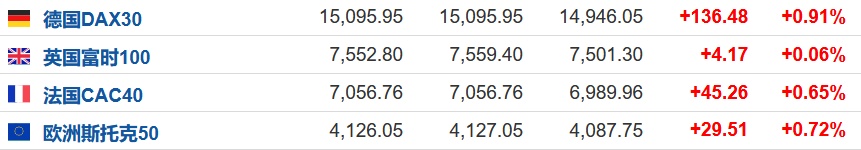 2.截至发稿,德国DAX指数涨0.91%,英国富时100指数涨0.06%,法国CAC40指数涨0.65%,欧洲斯托克50指数涨0.72%。