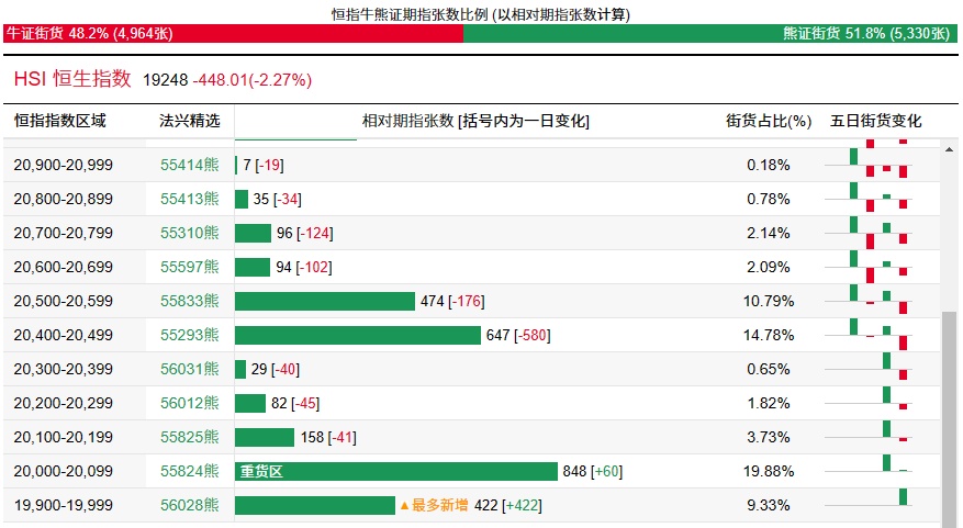 法兴恒指牛熊证街货分布图中的数据显示,熊证街货重货区在20000-20099区间,该区间最新熊证数量为848张,较上一交易日增加60张;最多新增在19900-19999区间,该区间最新熊证数量为422张,较上一交易日增加422张。