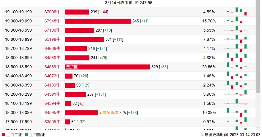 牛证街货重货区在18500-18599区间,该区间最新牛证数量为829张,较上一交易日增加88张;最多新增亦在18000-18099区间,该区间最新牛证数量为325张,较上一交易日增加158张。
