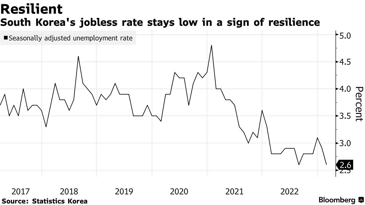 韩国的失业率保持在低水平附近,显示出韩国经济韧性