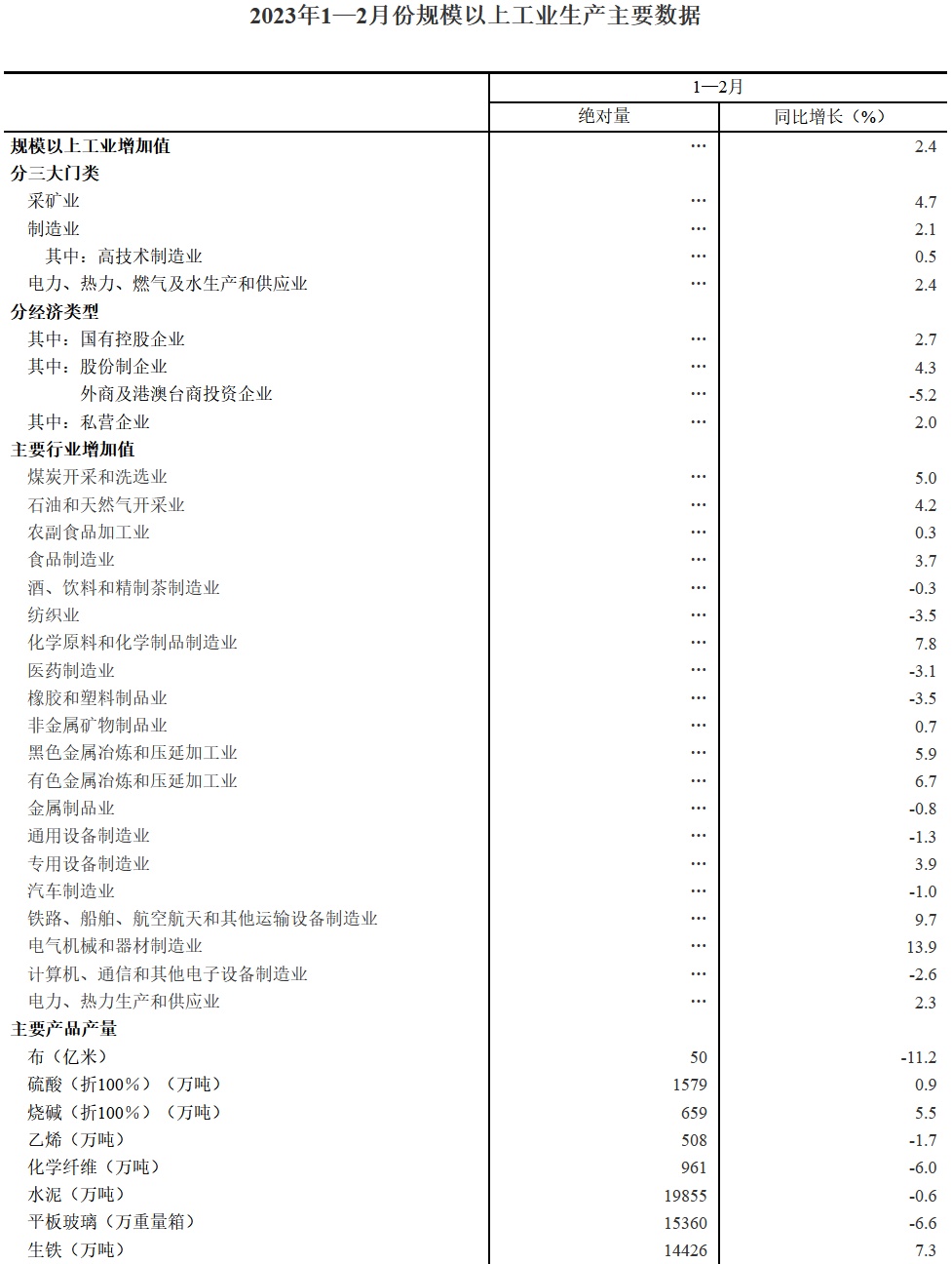 1—2月份,规模以上工业增加值同比实际增长2.4%(增加值增速均为扣除价格因素的实际增长率)。从环比看,2月份,规模以上工业增加值比上月增长0.12%。