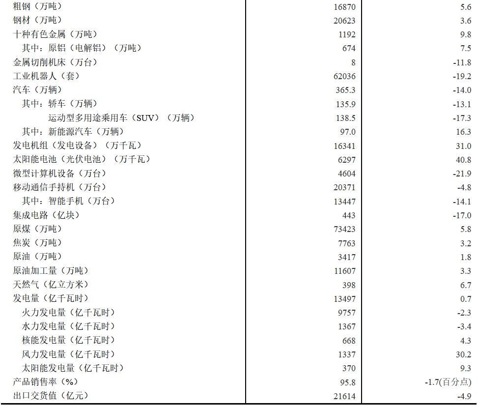 分产品看,1—2月份,620种产品中有269种产品产量同比增长。钢材20623万吨,同比增长3.6%;水泥19855万吨,下降0.6%;十种有色金属1192万吨,增长9.8%;乙烯508万吨,下降1.7%;汽车365.3万辆,下降14.0%,其中新能源汽车97.0万辆,增长16.3%;发电量13497亿千瓦时,增长0.7%;原油加工量11607万吨,增长3.3%。