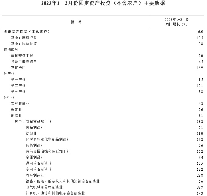 智通财经APP获悉,3月15日,国家统计局公布2023年1—2月份全国固定资产投资情况,1—2月份,全国固定资产投资(不含农户)53577亿元,同比增长5.5%。其中,民间固定资产投资29420亿元,同比增长0.8%。从环比看,2月份固定资产投资(不含农户)增长0.72%。