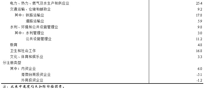 第三产业中,基础设施投资(不含电力、热力、燃气及水生产和供应业)同比增长9.0%。其中,水利管理业投资增长3.0%,公共设施管理业投资增长11.2%,道路运输业投资增长5.9%,铁路运输业投资增长17.8%。