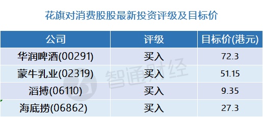 智通财经APP获悉,花旗发布研究报告称,在上周举行的一个内地消费成都访问团观察到,上周实体商品的消费情绪较预期弱,维持第一季销售数据没有上行惊喜的预期,但对下半年消费复苏持乐观态度,并预计餐饮等服务相关消费行业在第二至第三季会有更快的消费复苏。该行在必需性消费股内首选华润啤酒(00291)及蒙牛乳业(02319),滔搏(06110)为运动服装首选,海底捞(06862)则为餐饮股首选。