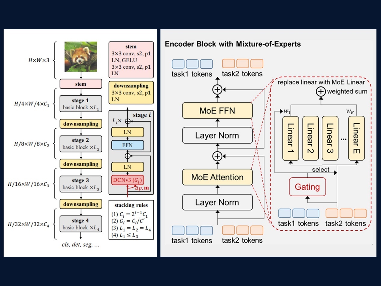 其中,InternImage-G通用视觉大模型能够基于动态稀疏卷积算子自适应地调整卷积的位置和组合方式,从而为多功能视觉感知提供强大的表示。超大语言模型通过在超大规模丰富文本语料库上进行预训练提供强大可靠的文本特征。Uni-Perceiver通才任务解码建模通过将不同模态的数据编码到统一的表示空间,将不同任务统一为相同的任务范式,从而能够以相同的架构和共享的模型参数同时处理各种模态和任务。此外,“书生2.5”还创新性地引入了任务级别的稀疏激活机制,使其具备高效的多任务协作能力。