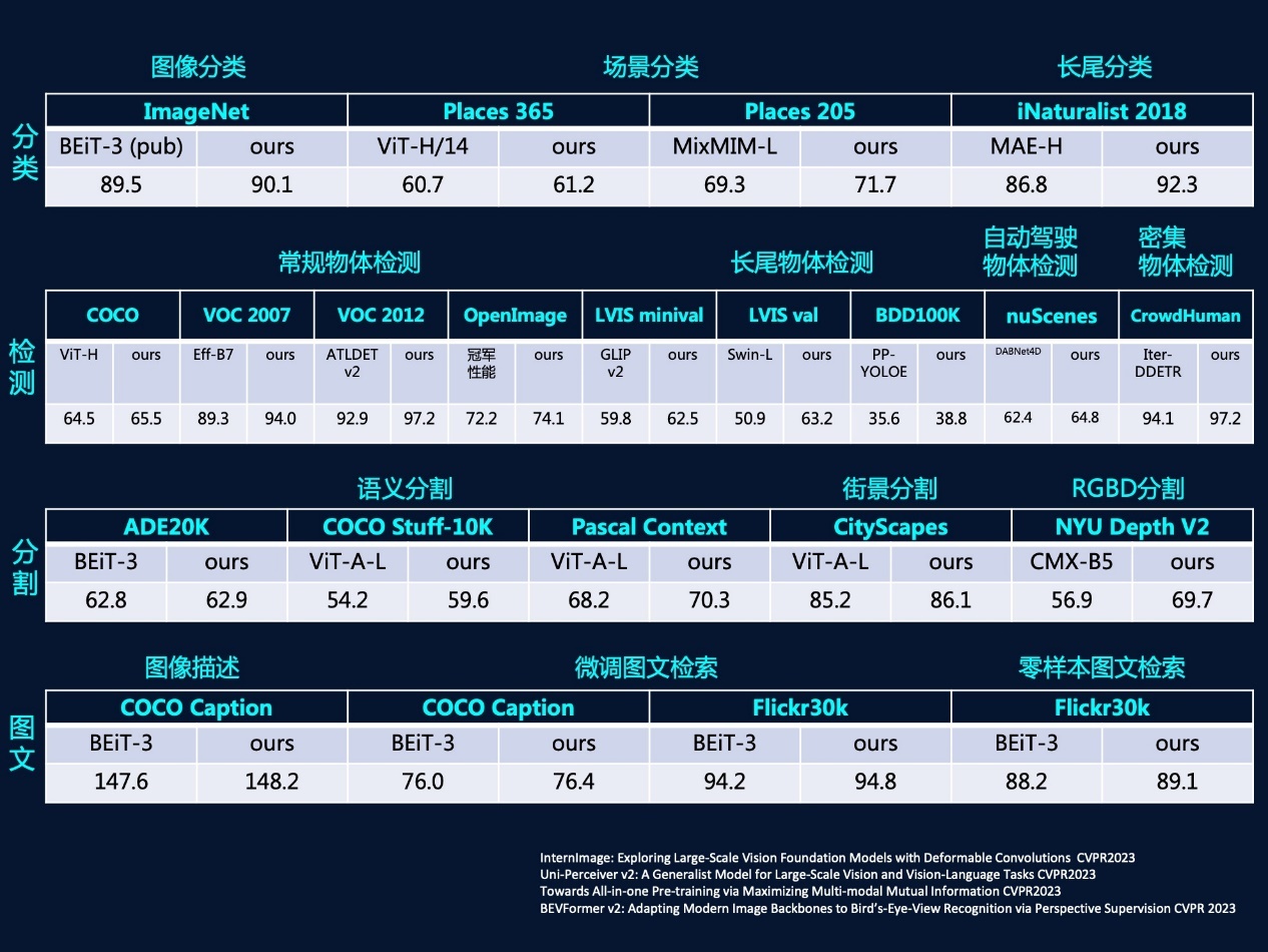 “书生2.5”拥有30亿参数,不仅是世界上开源模型中ImageNet准确度最高、规模最大的模型,也是物体检测标杆数据集COCO中唯一超过65.0 mAP的模型。目前,“书生2.5”多模态通用大模型已在通用视觉开源平台OpenGVLab开源(https://github.com/OpenGVLab/InternImage),为学术界和产业界的多模态通用模型研发提供有力支撑。