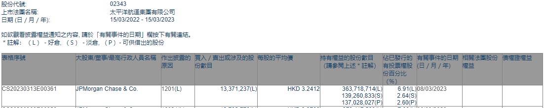 智通财经APP获悉,香港联交所最新资料显示,3月8日,小摩减持太平洋航运(02343)1337.1237万股,每股作价3.2412港元,总金额约为4333.89万港元。减持后最新持股数目约为3.64亿股,最新持股比例为6.91%。