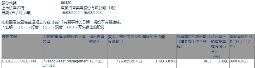 智通财经APP获悉,香港联交所最新资料显示,3月9日,Invesco Asset Management Limited减持东风集团股份(00489)约1.7603亿股,每股作价3.83港元,总金额约为6.74亿港元。减持后最新持股数目为0股。