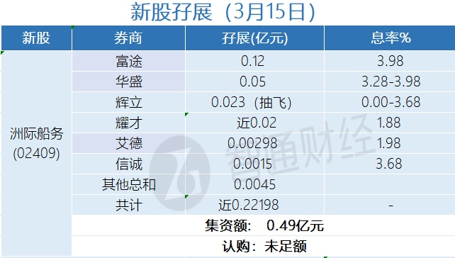 智通财经APP获悉,洲际船务(02409)正在招股中,截至3月15日,辉立、华盛等合计借出孖展近0.22198亿港元,认购未足额。