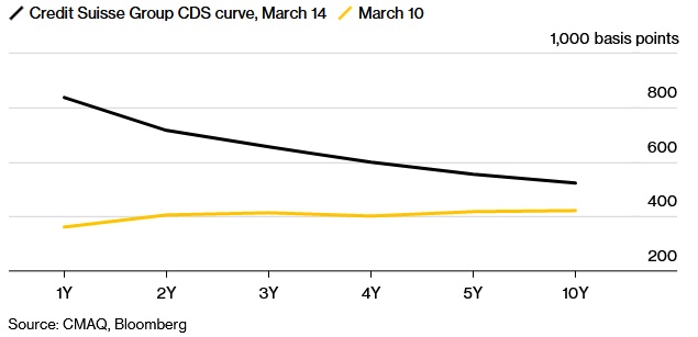 智通财经APP获悉,在硅谷银行倒闭引发美国银行业动荡之后,市场当前对近年来麻烦不断的瑞信(CS.US)有着强烈的担忧。CMAQ的报价显示,针对瑞信债券的一年期信用违约互换(CDS)在周二业务结束时的指示性报价为835.9个基点,且其他报价来源显示该CDS价格在周三进一步上涨并逼近1000个基点(CDS价格越高说明违约概率越大)。瑞信一年期CDS目前的价格水平约为竞争对手瑞银(UBS.US)的18倍、德意志银行(DB.US)的9倍。