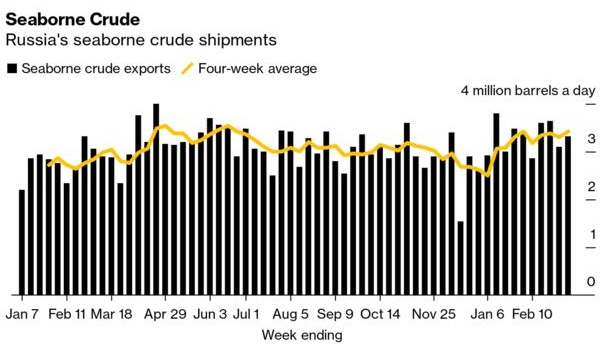 IEA估计,俄罗斯2月份原油及成品油出口平均下降50万桶/日至750万桶/日,为去年9月以来最低。该机构周三在其月度报告中表示:“尽管俄罗斯在维持产量方面相对成功,但其石油收入受到了冲击。”