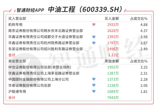 中油工程(600339.SH):龙虎榜阵容豪华,机构席位买入2933万元,买三是知名游资的席位买入2393万元,买四是知名游资的席位买入1787万元,当日净买入4195万元,该股今日强势反包,注意前期高点附近压力。