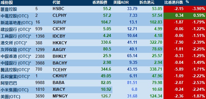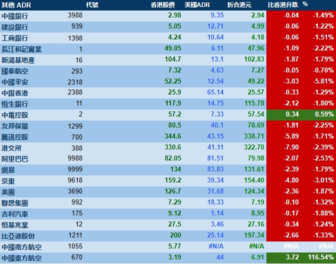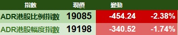 智通财经APP获悉,周三美股三大指数涨跌不一,港股ADR指数下跌,按比例计算,收报19085点,较香港收市跌454.24点或2.38%。