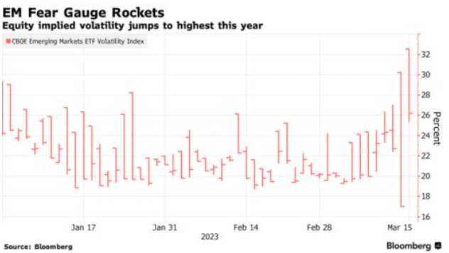 智通财经APP获悉,全球金融市场动荡加剧,给新兴国家带来了冲击,投资者在因瑞信(CS.US)股价下跌引发的新动荡中纷纷转向避险资产。“恐慌指数”CBOE新兴市场ETF波动率指数(相当于发展中国家股票的波动率指数)上涨7.7个百分点,创下近一年来的最大涨幅。