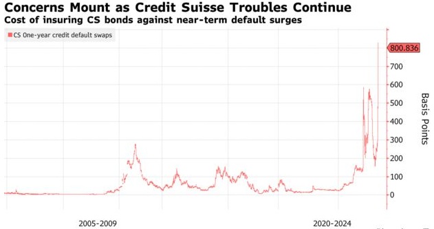 近年来经历了一系列丑闻的瑞信如今深陷困境,股价两年间跌幅已经超过80%,甚至在2022年10月传出破产的传闻。如今,在硅谷银行倒闭事件引发的冲击下,瑞信CDS价格在周三进一步上涨并逼近1000个基点(CDS价格越高说明违约概率越大)。这一增幅至少自2003年以来从未出现过,是20年平均水平的14倍以上,令大金融危机期间的水平相形见绌,凸显出投资者对该行流动性状况的消极态度。