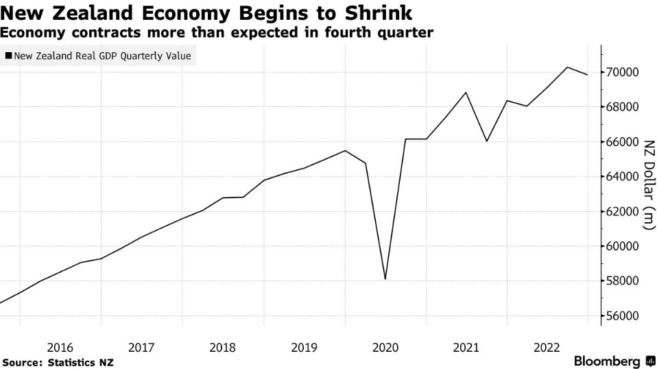 智通财经APP获悉,在2023年第四季度,新西兰经济收缩幅度超过预期,处于衰退边缘,促使投资者降低对新西兰联储进一步加息步伐的押注。据周四公布的官方数据显示,新西兰2022年第四季度GDP同比增长2.2%,市场预期为3.3%,上年同期为6.4%;第四季度GDP环比下降0.6%,市场预期下降0.2%,上年同期增长2%。