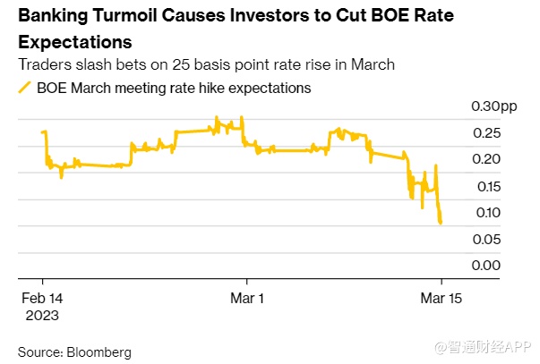 但金融市场的动荡可能会给英国央行下周的利率决定蒙上阴影。在对瑞信(CS.US)财务状况的担忧导致周三银行股遭到抛售后,投资者迅速削减了对英国央行将再次加息25个基点的押注。