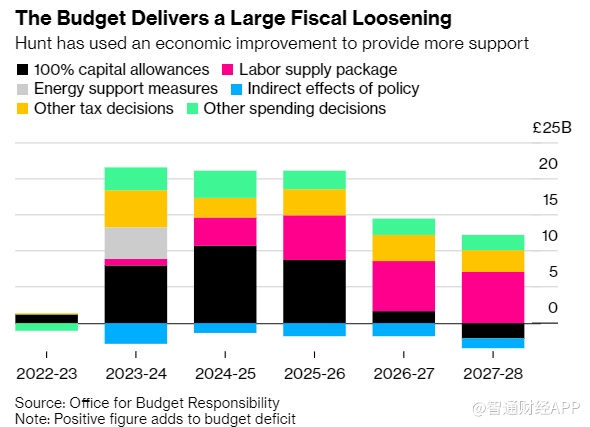 亨特的预算案拨出资金来缓解家庭能源和儿童保育费用飙升的影响。它还给予企业投资税收优惠,并允许储蓄者将更多收入用于养老金。其结果是,英国财政部到2028年将实施910亿英镑的财政刺激措施。