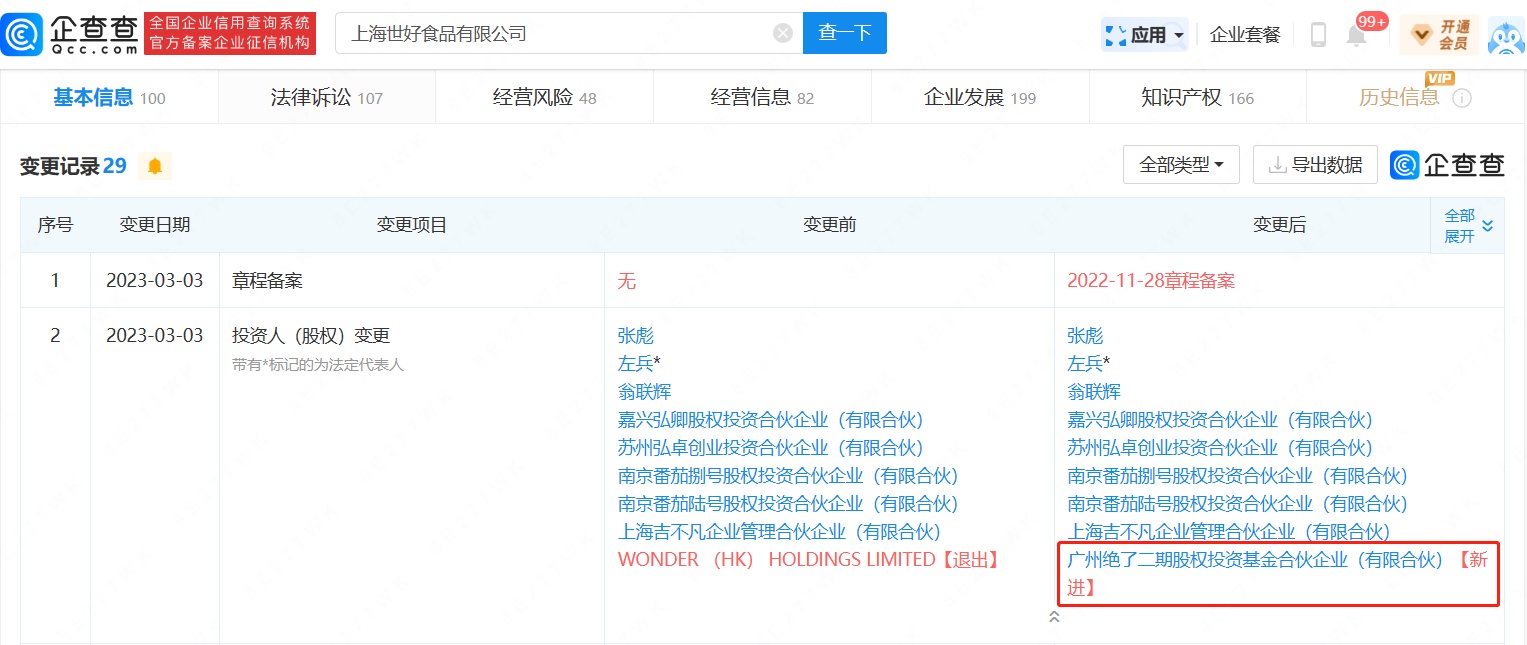 智通财经APP获悉,企查查APP显示,吉祥馄饨关联公司上海世好食品有限公司发生工商变更,WONDER(HK)HOLDINGS LIMITED