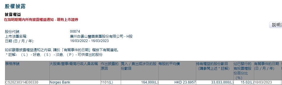 Bank增持白云山(00874)16.4万股,每股作价23.6957港元,总金额约为388.61万港元。增持后最新持股数目为3303.3万股,最新持股比例为15.02%。