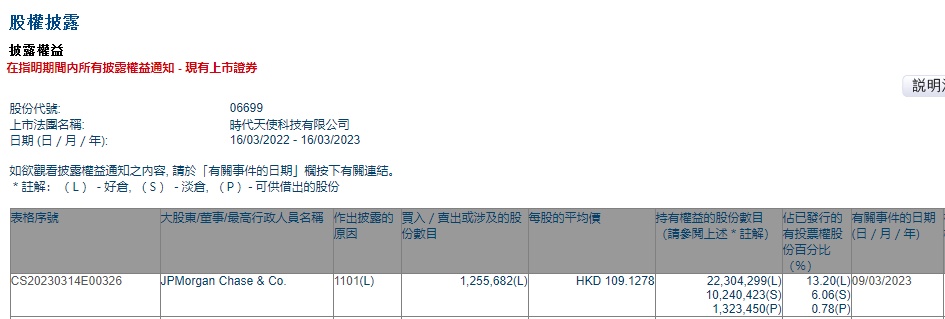 智通财经APP获悉,香港联交所最新资料显示,3月9日,小摩增持时代天使(06699)125.5682万股,每股作价109.1278港元,总金额约为1.37亿港元。增持后最新持股数目约为2230.43万股,最新持股比例为13.20%。