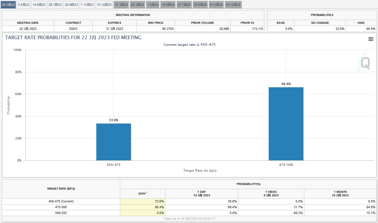 目前,芝加哥商品交易所的FedWatch Tool显示,美联储在下周加息25个基点的可能性为66.4%,而不加息的可能性为33.6%(高于前一天的30.6%)。