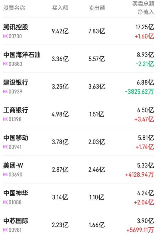 北水净买入最多的个股是腾讯(00700)、工商银行(01398)、中国神华(01088)。北水净卖出最多的个股是中海油(00883)、兖矿能源(01171)、建设银行(00939)。