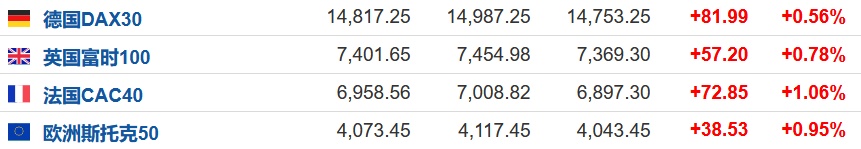 2.截至发稿,德国DAX指数涨0.56%,英国富时100指数涨0.78%,法国CAC40指数涨1.06%,欧洲斯托克50指数涨0.95%。