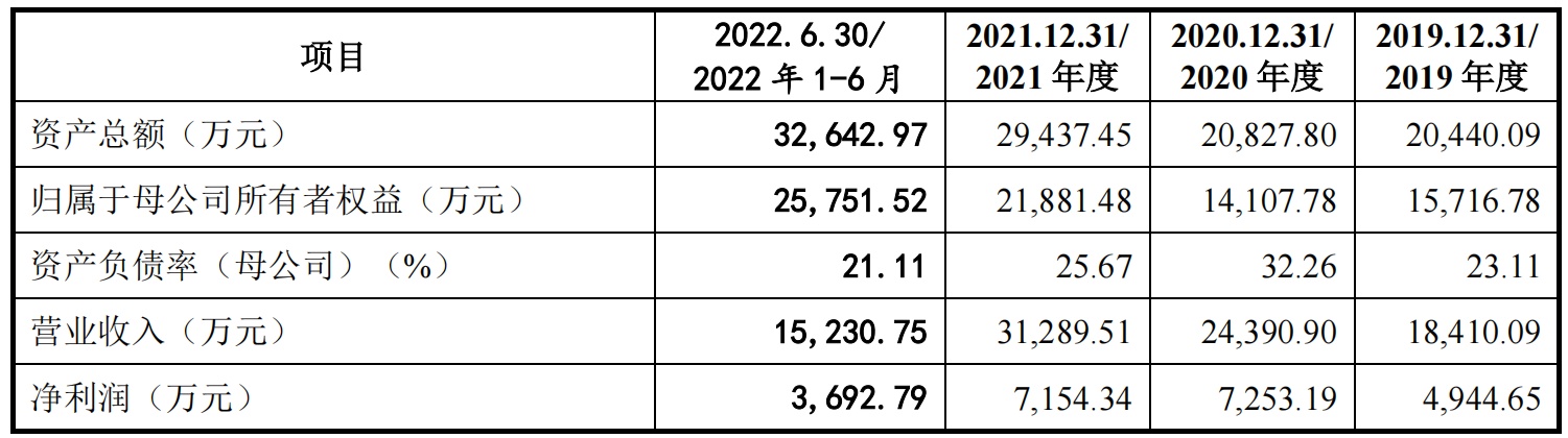 财务方面,于2019年度、2020年度、2021年度以及2022年6月30日止,公司实现营业收入分别为1.84亿元、2.44亿元、3.13亿元、1.52亿元。其中,公司实现净利润分别为4944.65万元、7253.19万元、7154.34万元、3692.79万元。