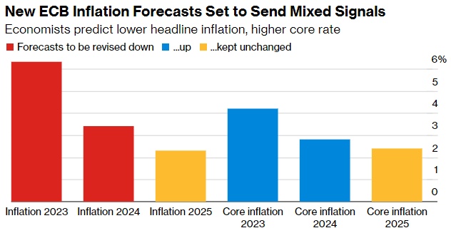 在最新的通胀预测方面,欧在央行预计今年整体通胀回落速度快于先前预期,但核心通胀被认为变得更具黏性。欧洲央行预计2023年欧元区通胀率为5.3%,之前的预测为6.3%;预计2024年通胀率为2.9%,之前的预测为3.4%;预计2025年通胀率为2.1%,此前预测2.3%。欧洲央行表示,2月份不包括能源和食品的(核心)通胀率继续上升,欧洲央行工作人员预计2023年的平均通胀率将达到4.6%,高于去年12月的预测。