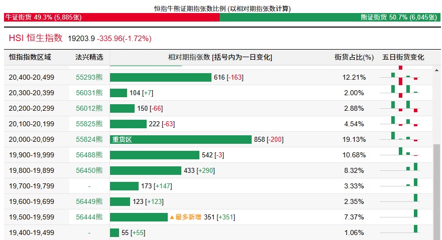 法兴恒指牛熊证街货分布图中的数据显示,熊证街货重货区在20000-20099区间,该区间最新熊证数量为858张,较上一交易日减少200张;最多新增在19500-19599区间,该区间最新熊证数量为351张,较上一交易日增加351张。