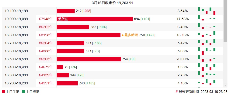 牛证街货重货区在19000-19099区间,该区间最新牛证数量为894张,较上一交易日增加161张;最多新增亦在18800-18899区间,该区间最新牛证数量750张,较上一交易日增加422张。