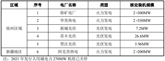 目前,公司的发电业务分布于江苏地区(徐矿电厂、华美热电、新城光伏、苏丰光伏、贾汪光伏)、新疆地区(阿克苏热电),核定装机规模共计1739.76MW。