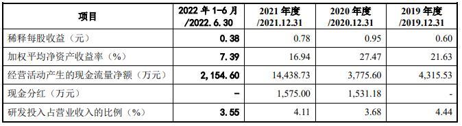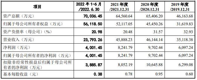 财务方面,于2019年度、2020年度、2021年度及2022年上半年,公司实现营业收入分别约为3.51亿元(人民币,下同)、4.61亿元、4.59亿元及2.38亿元;同期,公司净利润分别约为6097.24万元、9702.44元、8241.79万元及4001.45万元。
